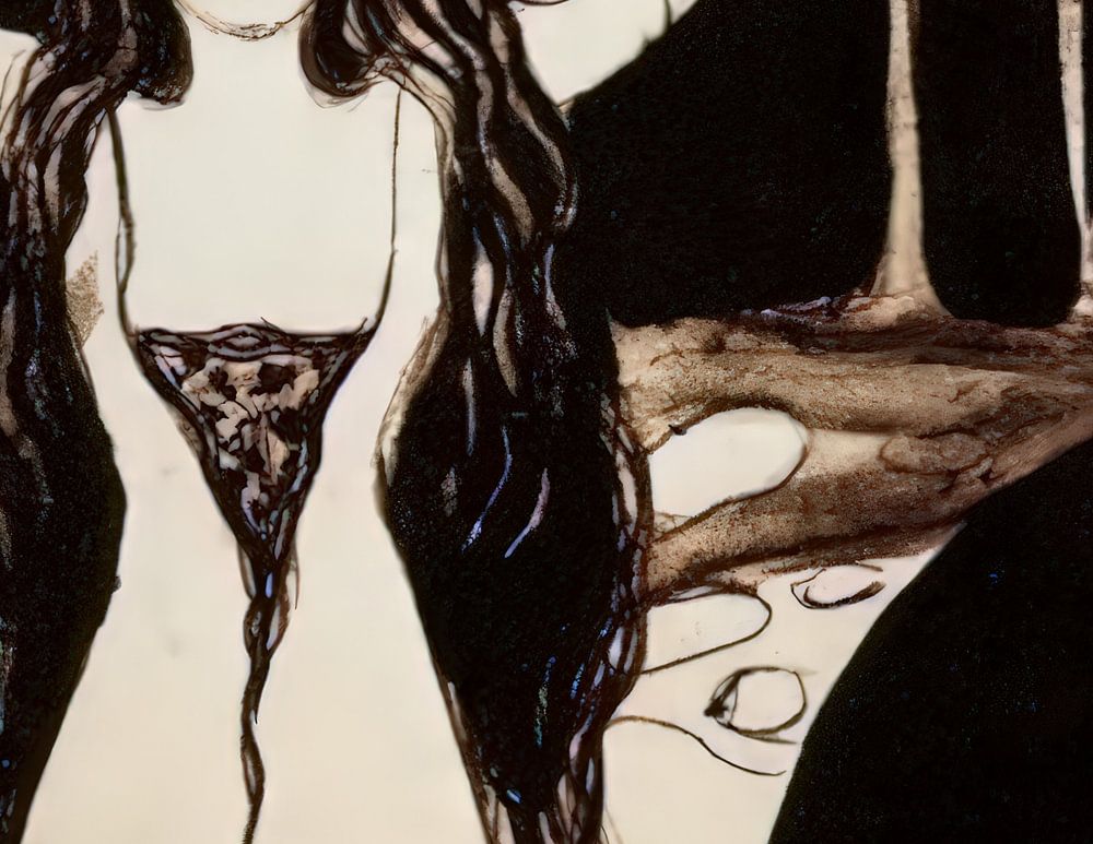 As II is een grimmige, beklemmende verkenning van de menselijke seksualiteit en de dualiteit van verlangen en schaamte. De houtsnede toont een eenzame vrouwenfiguur, naakt op een diep gestructureerde vaginale bedekking na, staande in een dorre, bosachtige omgeving.