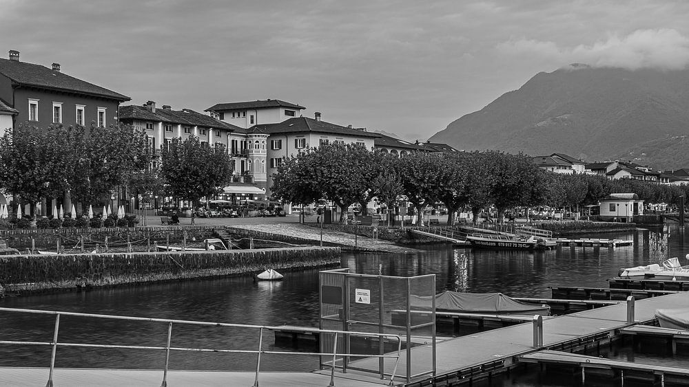 Een 16:9 foto in Zwart-Wit van een avond na zonsondergang in de stad Ascona, een juweel aan het Lago Maggiore en een waar paradijs met de directe ligging aan het meer met palmbomen, de gekleurde huizen, de mediterrane sfeer en het milde klimaat.