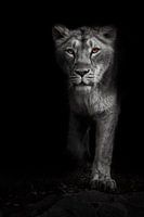 Koop dit leeuwen kunstwerk Ashen wit, asgrauwe maanverlichte nachtleeuwin in het donker met heldere ebbenhouten ogen. Zwartbees van Michael Semenov als print op canvas, aluminium dibond, (ingelijste) fotoprint, behang en ArtFrame. Voor jou op maat geprint in Fine-Art kwaliteit.