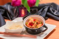 Asiatisches Gemüse mit Hähnchenstreifen und Reis.