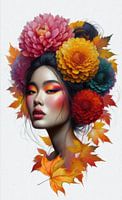 Samen vormen ze dit unieke, herfstachtige en sfeervolle portret van een prachtige Aziatische vrouw, omhuld door herfstbladeren- en bloemen.