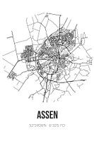Zwart-witte landkaart, stratenplan of plattegrond van Assen. Assen is gelegen in de gemeente Assen, provincie Drenthe. Op de stadskaart zijn alle openbare wegen in Assen opgenomen. Verder is de kaart voorzien van de coördinaten van het centrum van Assen.