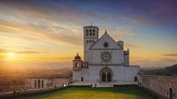 Assisi, San Francesco of Sint Franciscusbasiliek bovenkerk bij zonsondergang. Perugia, regio Umbrië, Italië, Europa.