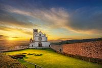 Assisi stad, San Francesco, of Sint Franciscus Basiliek bovenste kerk bij zonsondergang. Perugia, regio Umbrië, Italië, Europa.