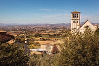 Stadsgezicht vanuit het hoger gelegen centrum van Assisi over de lager gelegen stadsdelen met de kerk van Franciscus