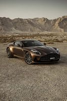 In deze compositie zie je een Aston Martin DB12 subtiel geparkeerd in een uitgestrekt woestijnlandschap, gevangen tijdens het gouden uur. De warme, bronskleurige lak weerkaatst zacht het invallende licht, terwijl de ruwe, stille achtergrond van zandkleurige bergformaties een krachtig contrast vormt met de verfijnde vormen van de auto.