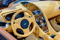 Aston Martin Vanquish Volante cabrio sportwageninterieur met lichte lederen en houten details.