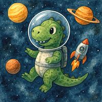 Een vrolijke dinosaurus zweeft door de ruimte met een brede glimlach, gehuld in een astronautenpak met glanzende helm. Om hem heen draaien kleurrijke planeten die doen denken aan Mars, Jupiter en Saturnus. De kleine roodbruine planeet lijkt op Mars, de mysterieuze ‘Rode Planeet’. De grote oranje bol met wervelende tinten roept de sfeer op van Jupiter, de reus van ons zonnestelsel. En de planeet met de opvallende ringen verwijst duidelijk naar Saturnus, met haar warme goudbruine gloed. Samen vormen ze een fantasierijke versie van het heelal, waarin werkelijkheid en verbeelding elkaar ontmoeten. De kleine details, zoals de zachte reflectie in zijn helm en de lichte schaduw onder zijn pootjes, geven het werk extra diepte en levendigheid.