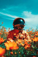 Een astronaut in fel oranje zweeft tussen gloeiende bloemen, de reflectie van een blauwe lucht op zijn vizier. Een fascinerend samenspel van natuur en technologie dat dromen van verre werelden oproept. Ideaal voor in de woonkamer, waar het gesprek en verbeelding stimuleert. Een blikvanger die uitnodigt tot verwondering.