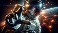 Een astronaut zweeft in de open ruimte en lijkt naar voren te reiken. De helm weerspiegelt een betoverende sterrenhemel, terwijl op de achtergrond de aarde en talloze stralende sterren zichtbaar zijn. Het beeld brengt een indrukwekkende mix van isolatie en de oneindige schoonheid van de kosmos over, benadrukt door de heldere kleuren en de gedetailleerde weergave van het ruimtepak.