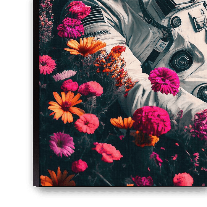 Waarom altijd nieuwe werelden ontdekken als de schoonheid van de aarde vlak voor onze ogen ligt? Deze astronaut ligt ontspannen in een bloemenveld, genietend van het uitzicht op de blauwe lucht.