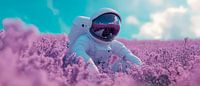 Een dappere astronaut verkent de ongerepte natuur in een surrealistisch droomland van felpaars. De levendige kleuren en het opvallende contrast tussen het ruimtepak en het bloemenveld creëren een magische sfeer. Dit betoverende kunstwerk is de perfecte aanvulling voor een woonkamer of creatieve studeerkamer en inspireert tot intergalactische gedachten.
