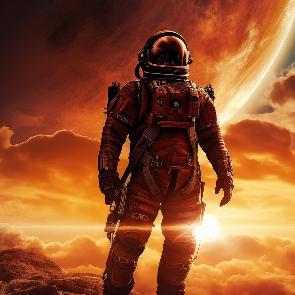 Unieke Astronaut met uitzicht op aarde en mars schilderij met een originele stijl. Met prachtige kleurtinten en een uniek ontwerp maakt dit tot een stijlvolle fotoprint die prachtig staat in elke ruimte.