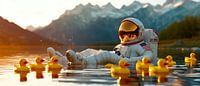Te midden van majestueuze bergen ontspant een astronaut zich in een meer, omringd door vrolijke badeendjes. Deze grillige scène straalt een charmante lichtheid uit en moedigt aan tot dagdromen. Perfect voor een kinderkamer of een creatief kantoor aan huis om inspiratie en verbeelding aan te moedigen - een echte blikvanger!