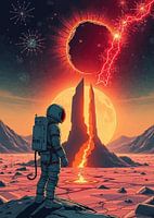 Een astronaut staat op een rotsachtige, gebarsten, roodgekleurde buitenaardse planeet en staart naar een dramatische hemel. Op de achtergrond wordt een grote, heldere maan gedeeltelijk aan het oog onttrokken door hoge, grillige rotsformaties waar lava langs stroomt. Daarboven domineert een donkere, cirkelvormige vorm met een rode corona en bliksemschichten de hemel, vergezeld van sterachtige formaties.