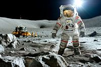 Stel je het gevoel van gewichtloosheid en avontuur voor: Een astronaut omringd door een surrealistisch maanlandschap, verlicht door een schitterend licht. De ruwe oppervlaktestructuur en mysterieuze sfeer wekken nieuwsgierigheid en ontdekkingsdrang op. Deze foto is perfect voor een moderne woonkamer of een inspirerend kantoor en geeft elke kamer een galactisch tintje.