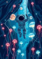 Een astronaut slingert tussen rotsformaties omringd door gloeiende kwallen. De scène speelt zich af tegen een blauwe, met sterren gevulde achtergrond waarop verschillende manen zichtbaar zijn. De kwallen stralen een zachte, etherische gloed uit die contrasteert met de donkere rotsen. De astronaut hangt aan twee touwen en lijkt te genieten van de rit. De algehele sfeer is grillig en dromerig, een combinatie van ruimteverkenning en zeeleven.