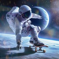 Een astronaut die op een skateboard de omgeving van een planeet verkent. Een leuke fantasie....