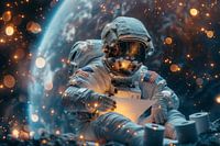 Humoristische foto van een astronaut die naar het toilet gaat voor een kleurrijke kosmische achtergrond, die een unieke mix weergeeft van het alledaagse leven en een surrealistisch ruimtelandschap.