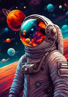 Een opvallend astronautenportret tegen een betoverende ruimteachtergrond, met levendige planeten en wervelende sterrenstelsels. De helm van de astronaut weerspiegelt de kosmische wonderen, terwijl zijn pak glanst in het verre sterrenlicht. Deze fascinerende afbeelding roept een gevoel op van avontuur en verkenning in het uitgestrekte heelal.