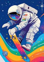 Een astronaut met een wit ruimtepak en een helm met een levendig, kleurrijk interieur is afgebeeld in de lucht, schijnbaar skateboardend in de ruimte. De helm is groot en rond, met aan de binnenkant een mix van wervelende, abstracte kleuren. Patches die de Amerikaanse vlag voorstellen en wat een kleinere, mogelijk nationale vlag lijkt te zijn, staan op het pak van de astronaut.