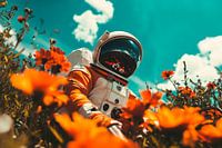 Stel je een astronaut voor die geniet van de gewichtloosheid van de aarde omringd door heldere bloemen. De oranje accenten van zijn ruimtepak harmoniëren perfect met de warme kleuren van de bloemen. Deze foto brengt een frisse, dromerige sfeer in de woonkamer en inspireert tot nieuwe avonturen en creatieve gedachten.
