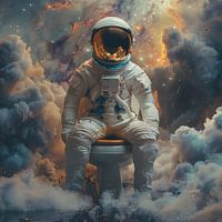 Een humoristische poster voor de badkamer toont een astronaut die ontspannen op een toilet in de ruimte zit.