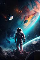 Deze adembenemende digitale art print van een astronaut in de ruimte brengt de magie van het universum in huis. De astronaut zweeft in het vacuüm van de ruimte, omringd door glinsterende sterren en majestueuze planeten.