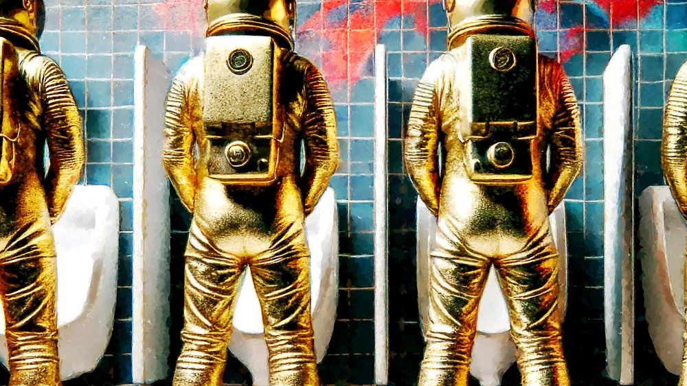De astronauten, van achteren gezien, staan daar alsof ze zojuist hun missie hebben onderbroken om een diep menselijke behoefte na te streven. Deze discrepantie tussen de pathos van de ruimte en de banaliteit van het dagelijks leven creëert een humoristische, bijna surreële spanningsboog.