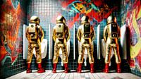 Vier figuren, gekleed in futuristische ruimtepakken van glinsterend goud, staan op een rij. Hun helmen - onberispelijk gepolijste spiegelkoepels - verbergen elke identiteit, maar weerspiegelen de levendige wereld die hen omringt. Alleen de felrode, glimmende metallic laarzen zorgen voor een bijna ironisch accent, alsof ze willen zeggen: "We zijn gekomen om onze stempel achter te laten."