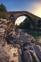 Een oude gerestaureerde Romeinse brug in de stad Cangas de Onis, in het midden van de Picos de Europa.