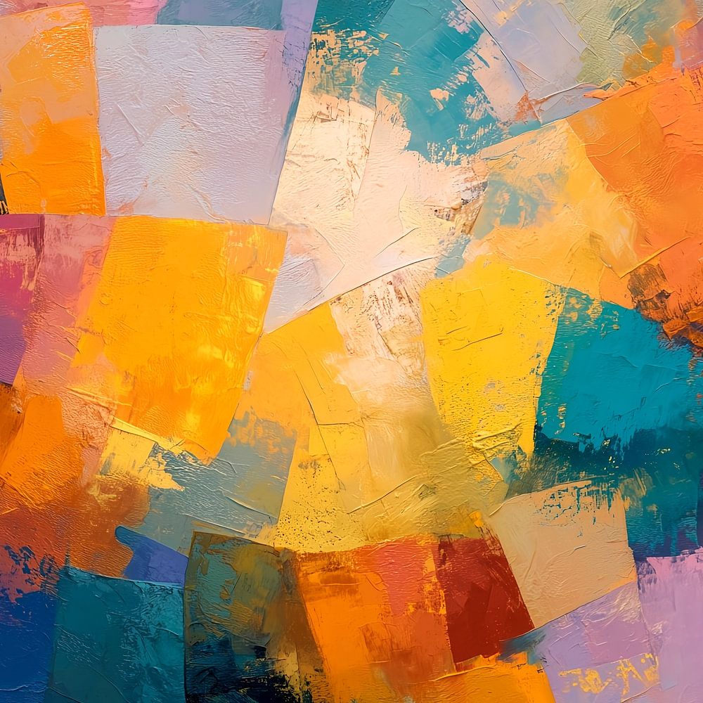 geometrische en onregelmatige vormen, aangebracht met gestructureerde penseelstreken om diepte en beweging over te brengen. Het algehele effect roept een gevoel van energie en harmonie op, met een evenwichtige verdeling van warme en koele…