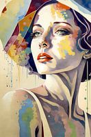 Kleurrijk mixed media portret van een vrouw met hoed in pastel tinten.