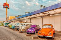 Vintage cars in a 60s look photo editing at the car wash. Alle auto's zijn Volkswagens gemaakt in de tijd van nu met een vintage jaren 60 bewerking.