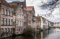 A beautiful view at some historic houses along the river In Gent/Ghent, Belgium! At the far end the city center!The image was taken from a bridge over the Leie river near the famous Groot Vleeshuis. Gent is the capital city of "Oost-Vlaanderen" and is situated between the famous cities Brugge and Antwerpen.