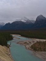 Landschapsopname van de wilde Athabasca-rivier in de gelijknamige vallei in de Rocky Mountains in Jasper National Park in Alberta, Canada op een bewolkte dag in de herfst, omringd door dichte bossen en met sneeuw bedekte bergen.