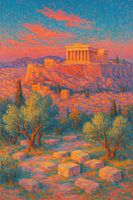 Het Parthenon verheft zich boven Athene in de gloed van een stralende zonsondergang, haar marmeren zuilen badend in roos en goud. De olijfbomen onder het Parthenon zwaaien onder het vervagende licht, hun groene bladeren glinsteren van de gereflecteerde warmte. Het landschap ademt geschiedenis - een tijdloos uitzicht geschilderd in de zachte, veranderende kleuren van de avond.