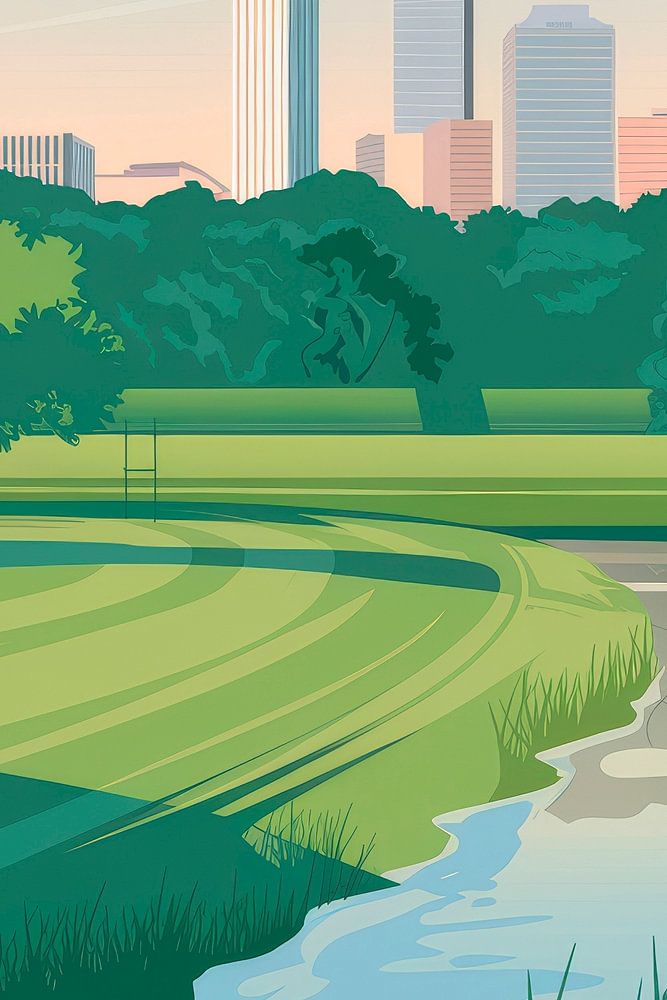 Een stralende ochtend in Atlanta wacht op de kijker: zachte pasteltinten nestelen zich rond de glinsterende wolkenkrabbers, terwijl de omringende natuur harmonieert met weelderig groen en een weerspiegelende waterloop. Deze moderne maar natuurlijke voorstelling is perfect voor de woonkamer om een ontspannen sfeer te creëren en het…