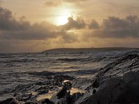 Foto is gemaakt tussen de kliffen in Ierland. Het laatste gouden zonlicht valt over de zee.