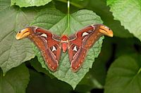 De atlasvlinder behoort tot de familie nachtpauwogen. Overwegend bruin met lichtere en donkere accenten. Kan een vleugelspanwijdte bereiken van 30 cm . Dit is een nachtactieve soort die niet veel vliegt. Als vlinder kan hij zicht niet voeden en teert op de energie opgenomen in het rupsstadium. Leeft slechts een week.
