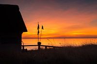 Een ochtendlucht in warme tinten rood en oranje op het strand van Scharbeutz aan de Oostzee, een klein stadje aan de Lübeckbaai in Noord-Duitsland/Sleeswijk-Holstein. Een klein rieten huisje / rieten dakhuisje