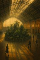 Atocha Station at Sunset verandert een van Madrid's drukste vervoersknooppunten in een kathedraal van licht en rust. Gouden stralen filteren door het enorme glazen plafond en verlichten de palmentuin in het hart. Silhouetten bewegen langzaam over de gepolijste vloer, hun schaduwen strekken zich uit in de richting van de vervagende dag,…