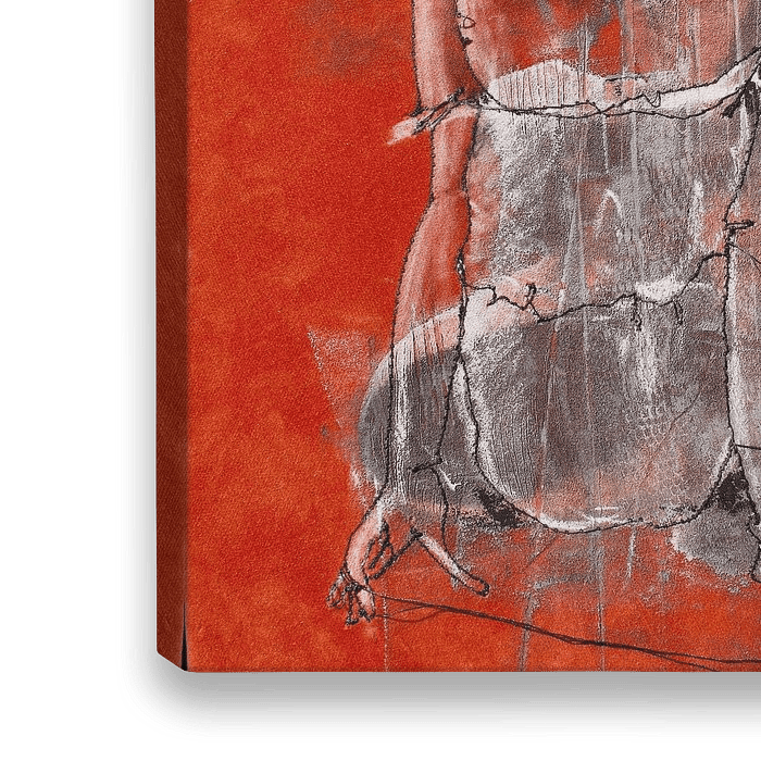 Een figuratief abstract werk van acryl en zwart draad op rood-oranje fluweel.