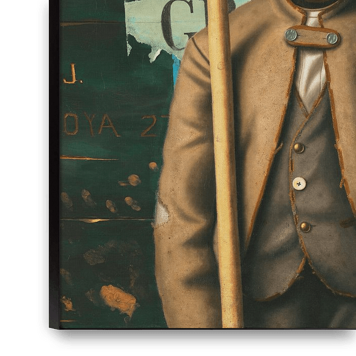 zei over zijn kunst. Maar welk verhaal biedt hij hier aan tegenover deze jonge jongen, bevroren in de aandacht als een schijterige soldaat, met zijn haveloze kleren, zijn knapperige krantenhoed, en de ondoorgrondelijke graffitimuur achter hem?