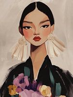 Elegant vrouwelijk portret met een moderne en stijlvolle uitstraling. Met rode lippen, opvallende witte oorbellen en een kimono vol bloemen is dit schilderij een echte blikvanger die kracht en verfijning toevoegt aan ieder interieur.