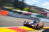 Audi R18 e-tron quattro Le Mans Prototyperace auto in Eau Rouge op Spa Francorcahmps tijdens de 2016 editie van de Zes uur van Spa. De auto rijdt op hoge snelheid en er zit bewegingsonscherpte in de foto en focus op de voorkant van de auto met het Audi logo.