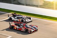 AudiR18 e-tron quattro en Porsche 919 Hybrid race auto's op het rechte stuk van Spa Francorchamps tijdens de 2016 editie van de Zes uur van Spa Francorchamps. De auto's rijden op hoge snelheid met veel bewegingsonscherpte en de scherpte ligt op de Porsche in de achtergrond.