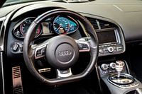 Audi R8 sportwagen dashboard. De Audi R8 is een tweezits sportwagen met middenmotor die wordt geproduceerd en op de markt gebracht door de Duitse autofabrikant Audi. De Audi R8 V10 Plus is een high-performance variant van de Audi R8 sportwagen.