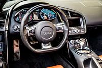 Audi R8 sportwagen dashboard. De Audi R8 is een tweezits sportwagen met middenmotor die wordt geproduceerd en op de markt gebracht door de Duitse autofabrikant Audi. De Audi R8 V10 Plus is een high-performance variant van de Audi R8 sportwagen.