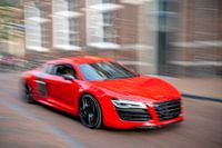 Audi R8 V10 Plus sportwagen rijdend op een straat. De Audi R8 is een tweezits sportwagen met middenmotor die wordt geproduceerd en op de markt gebracht door de Duitse autofabrikant Audi. De Audi R8 V10 Plus is een high-performance variant van de Audi R8 sportwagen.